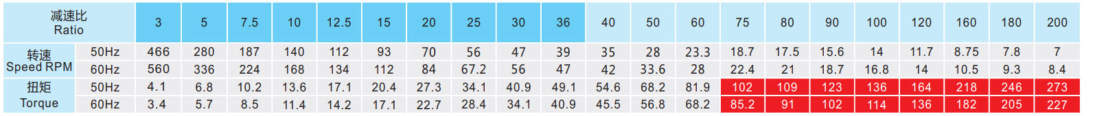▲ 表列轉(zhuǎn)速是基于電機(jī)異步轉(zhuǎn)速(50Hz:1400r/min、60Hz:1680r/min),額定負(fù)載時(shí),實(shí)際轉(zhuǎn)速為表列轉(zhuǎn)速的80%-98%。