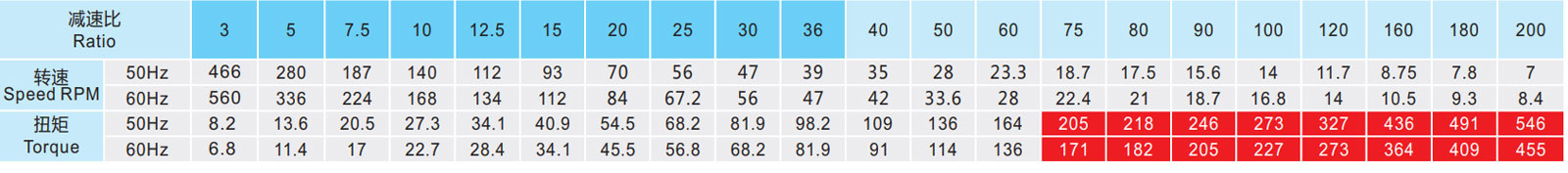 ▲ 表列轉(zhuǎn)速是基于電機(jī)異步轉(zhuǎn)速(50Hz:1400r/min、60Hz:1680r/min),額定負(fù)載時(shí),實(shí)際轉(zhuǎn)速為表列轉(zhuǎn)速的80%-98%。