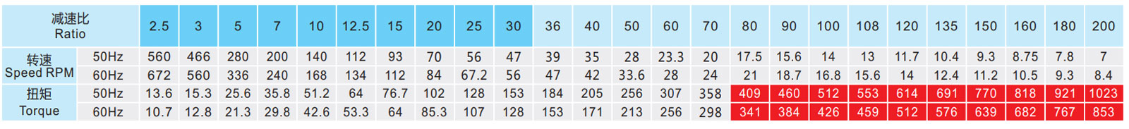 ▲ 表列轉(zhuǎn)速是基于電機(jī)異步轉(zhuǎn)速(50Hz:1400r/min、60Hz:1680r/min),額定負(fù)載時(shí),實(shí)際轉(zhuǎn)速為表列轉(zhuǎn)速的80%-98%。