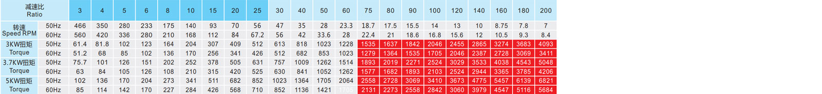 ▲ 表列轉(zhuǎn)速是基于電機異步轉(zhuǎn)速(50Hz:1400r/min、60Hz:1680r/min),額定負(fù)載時,實際轉(zhuǎn)速為表列轉(zhuǎn)速的80%-98%。